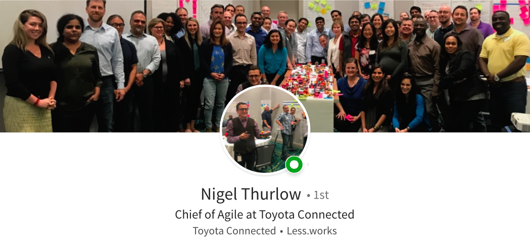 In 2017 following 2 1/2 years with the creator of Scrum, Jeff Sutherland, Nigel has moved back to his roots and re-joined Toyota as the Chief of Agile with Toyota Connected, the Toyota company building the future of connected vehicle technologies.